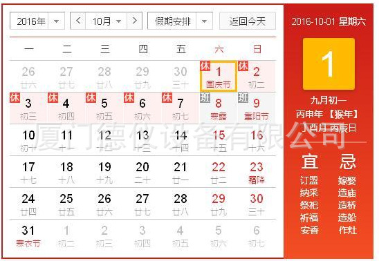 国庆节到了,厦门德仪设备有限公司全体员工提前祝新老客户朋友们,祝福您:国庆、家庆,普天同庆;官源、财源,左右逢源;人缘、福缘,缘缘不断;情愿、心愿,愿愿随心。国庆快乐!