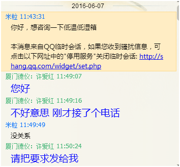 当时客户让我把这款低温低湿干燥箱DYCD-100的报价单发给她时,郭小姐一收到我的发的报价单,回我:这款设备的价格人民币36800远远超过了公司的预算,先与领导商量一下,2016年6月20日客户QQ回我