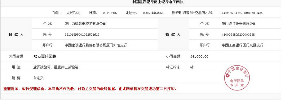 经过厦门德仪高级技术工程师及全体员工们辛苦工作30天,2017年4月14日两台设备完美收工,但客户验人员出差,2017年4月20日 客户才派员到厦门德仪公司验收。力鼎技术人员按照合同约定一一核对参数,两台设备各项参数完全符合,验收顺利完成。等这两台设备验报告呈上,力鼎采购于2017年5月6日 才安排付款,感谢厦门力鼎公司对厦门德仪公司的信任与支持!