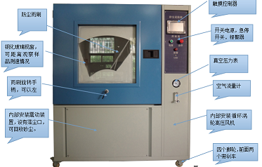 带负压砂尘箱应用领域:该设备的主要作用是用于电子 电工产品、灯具、电柜、电器元件、汽车、摩托车及其零部件等产品在模拟粉尘的气候条件下,对产品的物理以及其它相关性能进行测试。测试后,通过检定来判断产品的性能是否达到要求,以便于产品的设计、改进、检定及出厂检验使用。