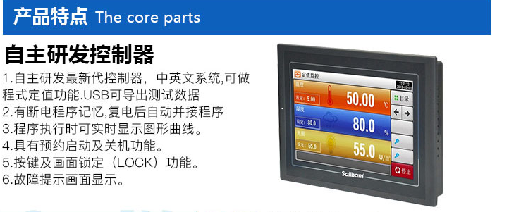 4画面显示功能 | 彩画面对谈式,无须按键输入,屏幕直接触摸选项; 温度设定(SV)与实际(PV)值直接显示; 可显示目前执行程序号码,段次,剩余时间及循环次数; 运转累计时间功能; 温度程序设定值以图形曲线显示,具实时显示程序曲线执行功能; 具单独程序编辑画面,每页较少可输入5个段次温湿度及时间; 中英文可任意切换; 故障提示画面显示; 屏幕可作背光调整; 屏幕显示保护功能可作定时,TIMER或手动关闭设定. |